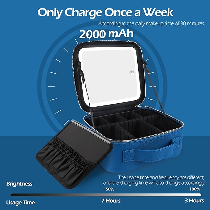 MOMIRA Travel Makeup Bag Cosmetic Bag Makeup Organizer Bag with Lighted Mirror, Adjustable Brightness in 3 Color Scenarios, Waterproof Makeup Train Case, Gift for Women - Cyan Blue