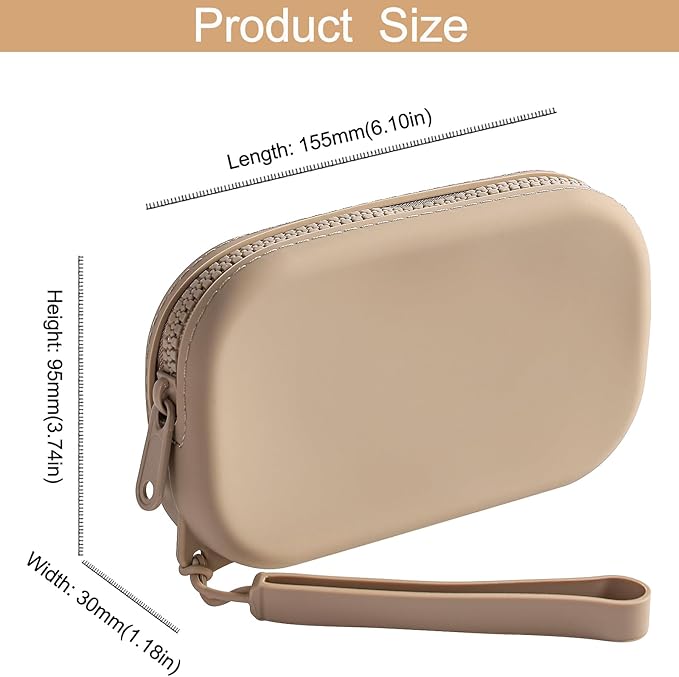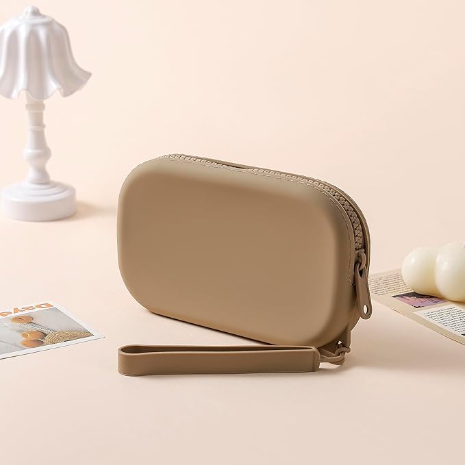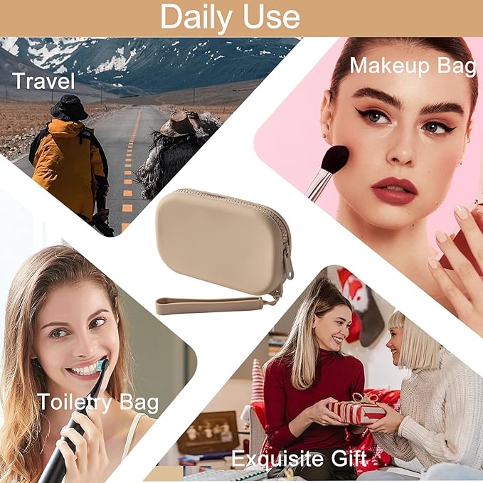 Portable Silicone Makeup Bag for Women, Small Travel Waterproof Toiletry Cosmetic Bag, Zipper Closure Organizer Makeup Case with Handle (Khaki)