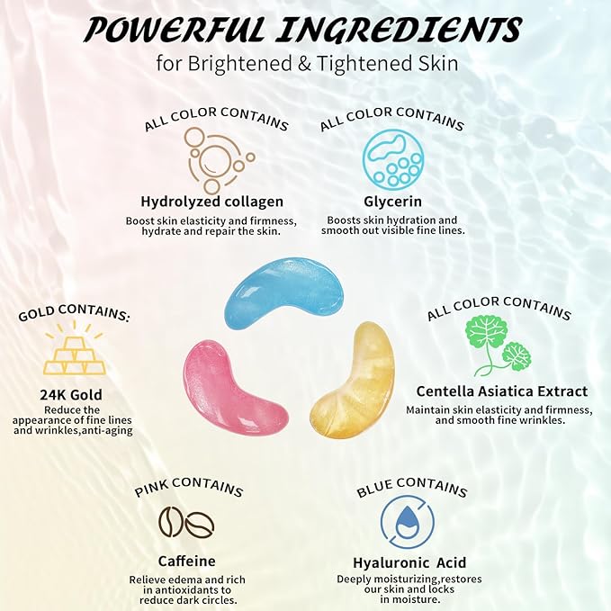 - Comprehensive Eye Mask Gift Set: This gift set includes 15 pairs of under-eye patches in three vibrant colors, each designed for specific benefits: 24K Gold Masks for smoothing wrinkles and boosting elasticity. Pink Caffeine Masks to reduce dark circles and refresh tired eyes. Blue Hyaluronic Acid Masks for deep hydration and soothing moisture. It’s a luxurious, all-in-one solution to elevate any self-care routine.