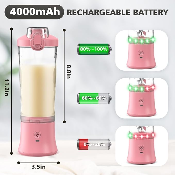 - Portable Design: This on the go blender has a built-in 4000mAh battery and supports USB charging, making it convenient to charge anywhere. This mini portable blender for smoothies and shakes features a lightweight design, making it perfect for travel, the gym, and the office. It's easy to carry and fits in backpacks, gym bags, or car cup holders.