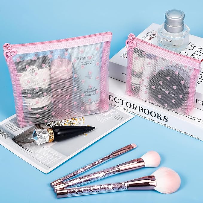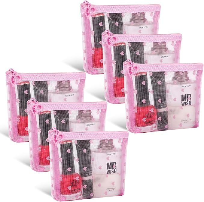 6 Pack Mini Zipper Mesh Makeup Bags, Heart Print Nylon Cosmetic Bags Toiletry Bags for Office Travel Organization (Widened-Pink, XS)
