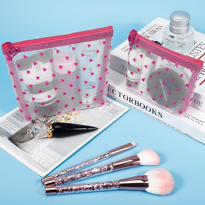 6 Pack Mini Zipper Mesh Makeup Bags, Heart Print Nylon Cosmetic Bags Toiletry Bags for Office Travel Organization (Widened-Hot Pink, XS)