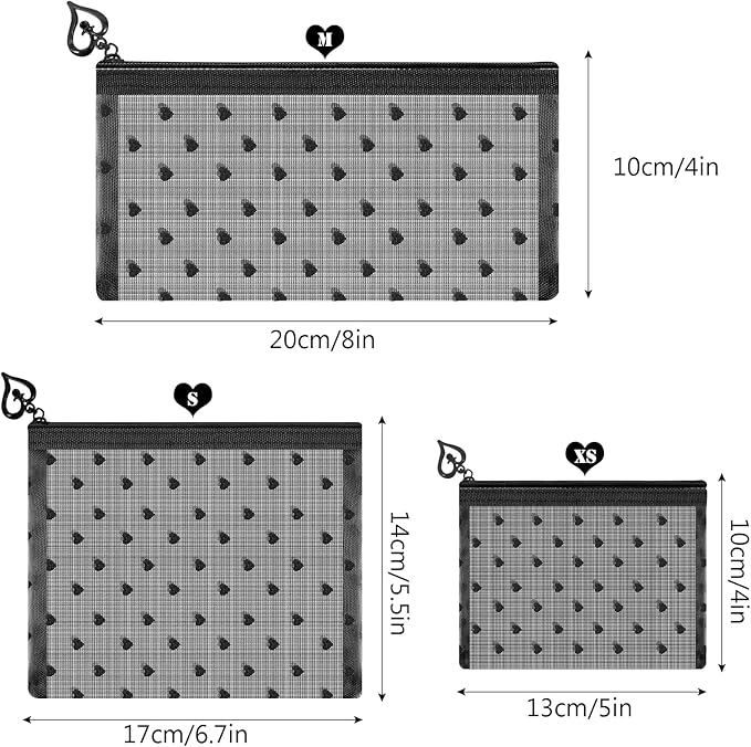 6 Pack Mini Zipper Mesh Makeup Bags, Heart Print Nylon Cosmetic Bags Toiletry Bags for Office Travel Organization (Black, XS)