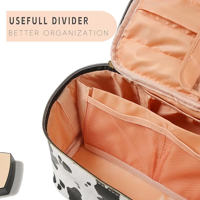 Meiyuuo Birthday Gifts Personalized Makeup Bag Cute Cosmetic Bags Large Travel Pro Pouch Toiletry Bag with Divider and Handle Teens Tweens Gifts Trendy Stuff Cow Print K