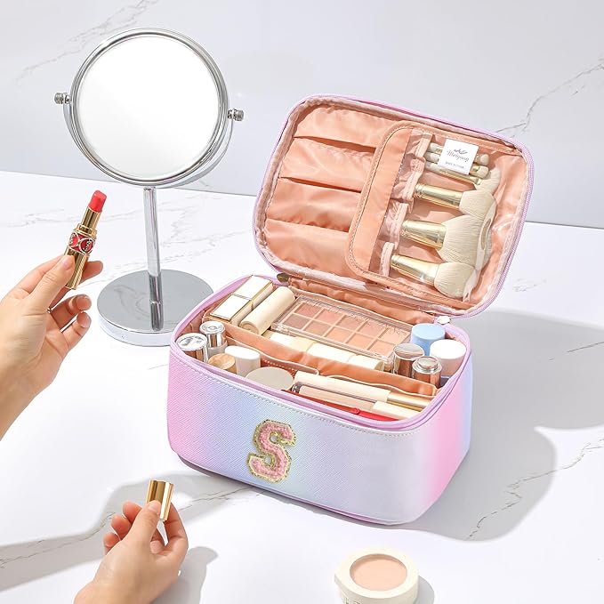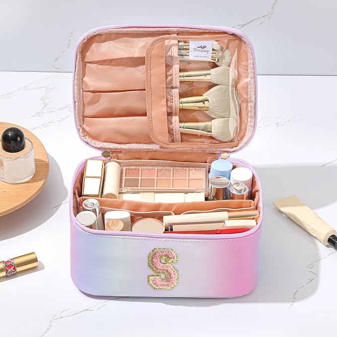 Meiyuuo Large Makeup Bag Cute Travel Pro Cosmetic Bags Personalized Chenille Letter Bag Travel Toiletry Organizer for Women Teen Girls Gifts for Her Preppy Rainbow Pink S