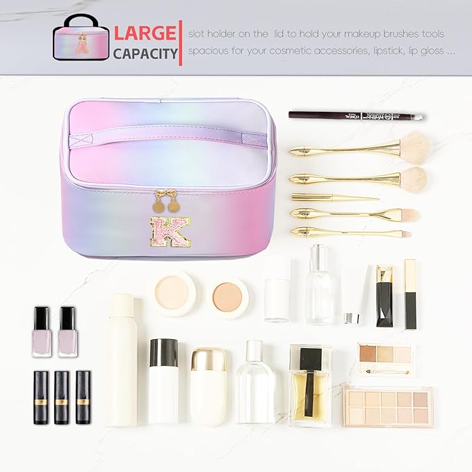 Meiyuuo Large Makeup Bag Travel Pro Cosmetic Bags Cute Chenille Letter Pouch Rainbow Pink Personalized Toiletry Organizer for Women Teen Girls Birthday Gifts for Her Preppy Rainbow Pink K