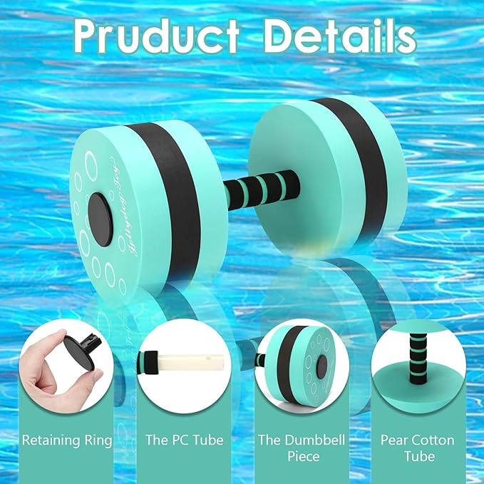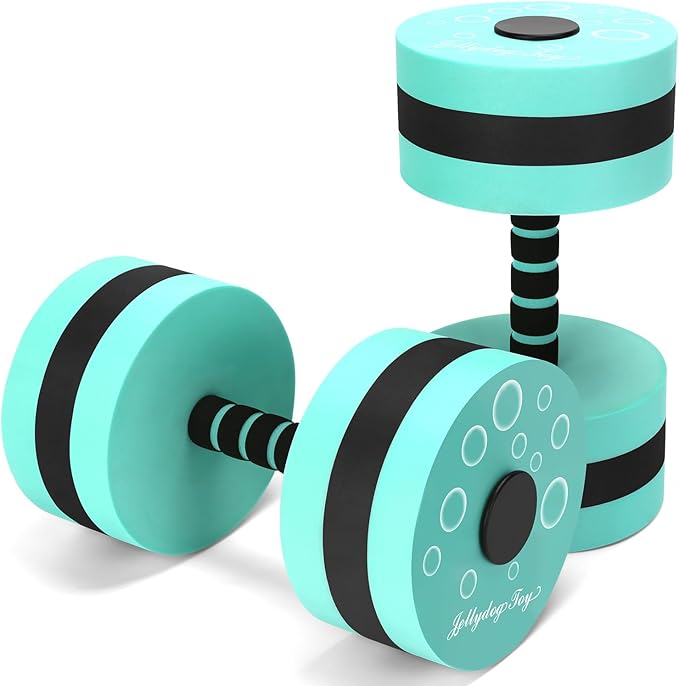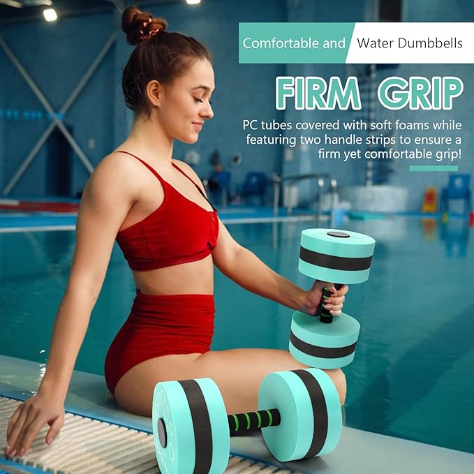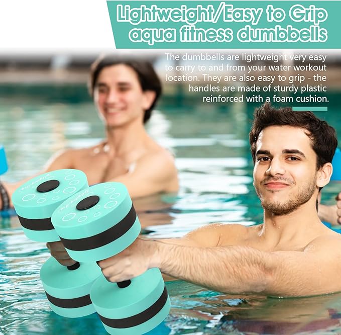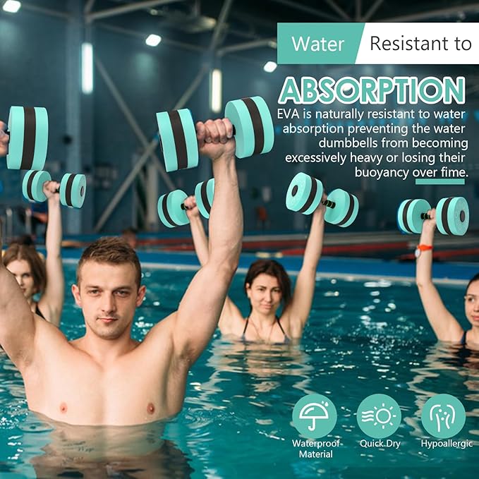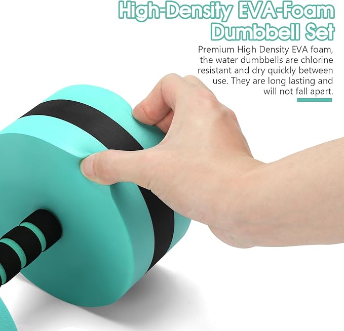 - High-Density EVA-Foam Dumbbell Set-Made of premium High Density EVA foam, the water dumbbells are chlorine resistant and dry quickly between use. They are long lasting and will not fall apart.