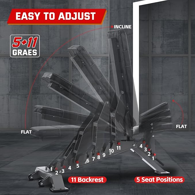 - 【Adjustable Design】: Enjoy 5+11 adjustable positions,our home gym heavy duty bench offers 11backrest positions and 5 seat positions, allowing for incline, flat, and decline configurations.Teclor weight bench allowing you to target various muscle groups and perform a wide range of exercises with ease