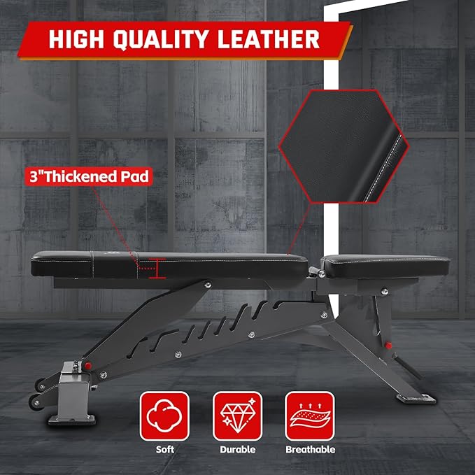 - 【Comfort and Convenience】: Made with soft leather and equipped with an adjustable seat cushion, this bench offers comfort during workouts and stability for every exercise
