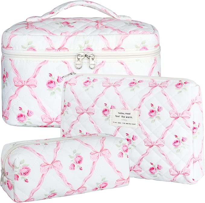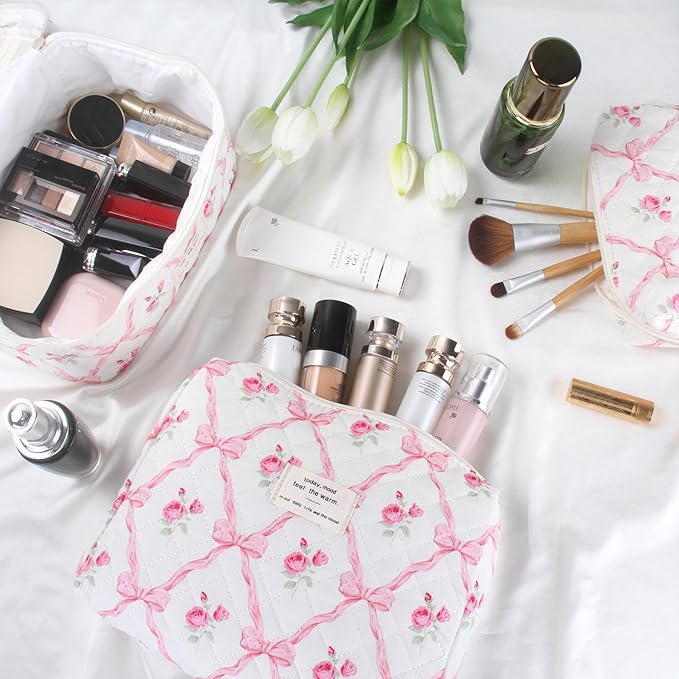 - 【GEOMETRIC AESTHETIC DESIGN】 This quilted bag features a chic, simple, and elegant pink bow and rose pattern, comfortable to the touch. Suitable for your everyday makeup routine and special occasions, allowing you to showcase your personal style