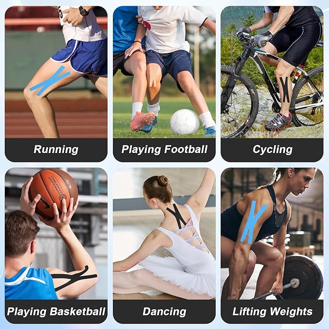 - IMPROVE SPORTS PERFORMANCE: Elastic sports tape has a significant effect on relieving sports injuries, preventing cramps, increasing endurance, eliminating lactic acid, and improving sports performance. They can help athletes and ordinary people relieve pain, relax muscles, and promote physical recovery. They are generally suitable for various endurance and explosive sports, such as running, cycling, swimming, triathlon, tennis, etc.