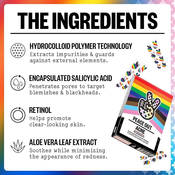 - Peace Out’s Breakthrough Acne Dots in a limited edition Pride Progress Flag pattern: The only patented, medicated, acne-fighting pimple patch that combines clean hydrocolloid polymer technology and actives promoting clearer skin overnight.