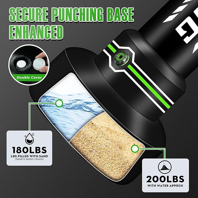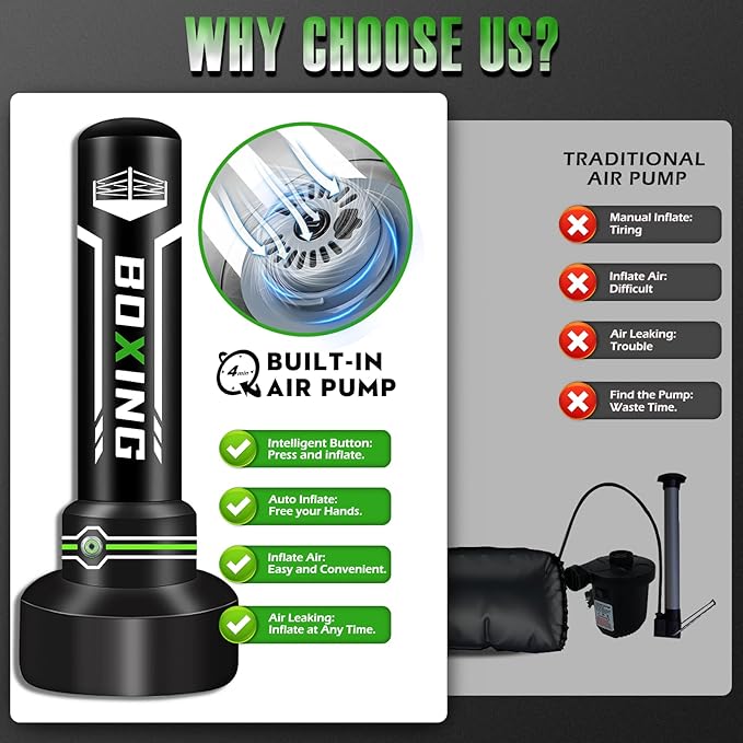 - Upgrade Automatic Inflation Pump: The heavy punching bag made with built-in rechargeable automatic air pump, upgraded one press inflating technology helps you inflate the stand up punching bag more conveniently, completely freeing your hands, allowing you to use the punching bag for adults with stand anytime and anywhere.