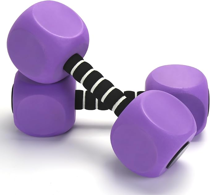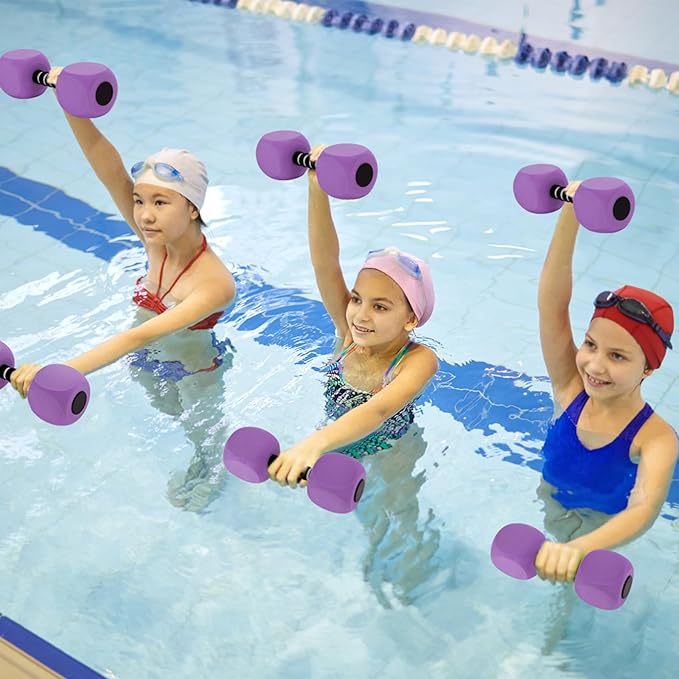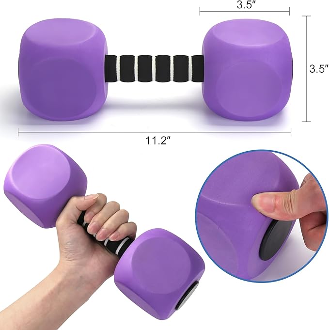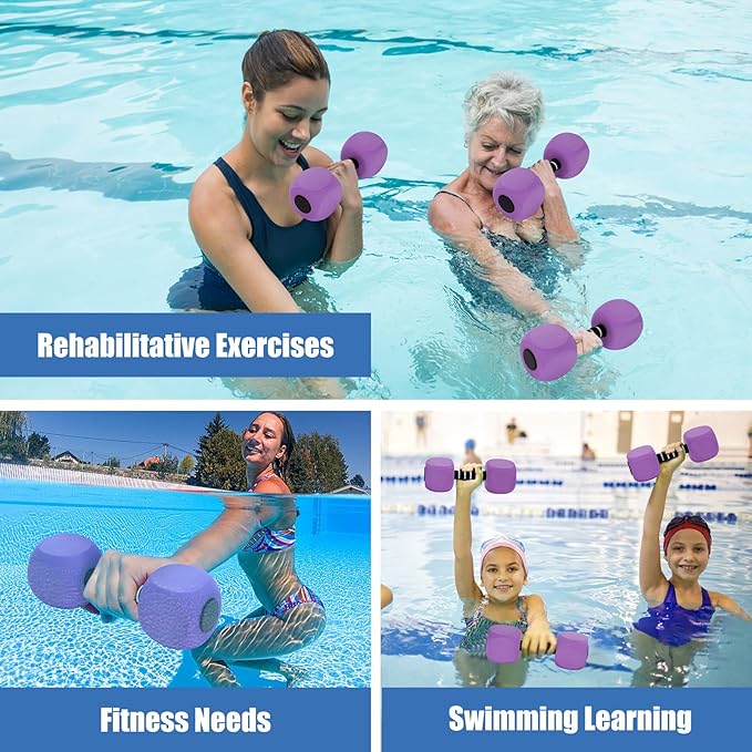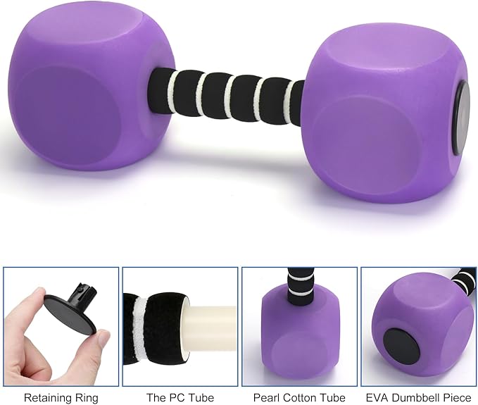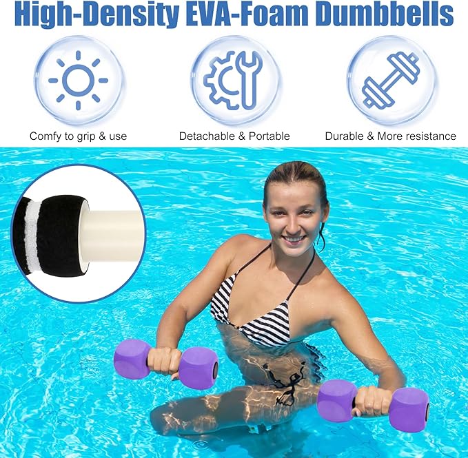 - The aquatic dumbbells for water aerobics is a perfect aquatic fitness tool, designed in modern & ergonomic Design. EVA foam cushion padded around the hand bar, offering a more comfortable & anti-slip grip. Medium diameter fit for women adults. Buckle Design is for freely assemble.