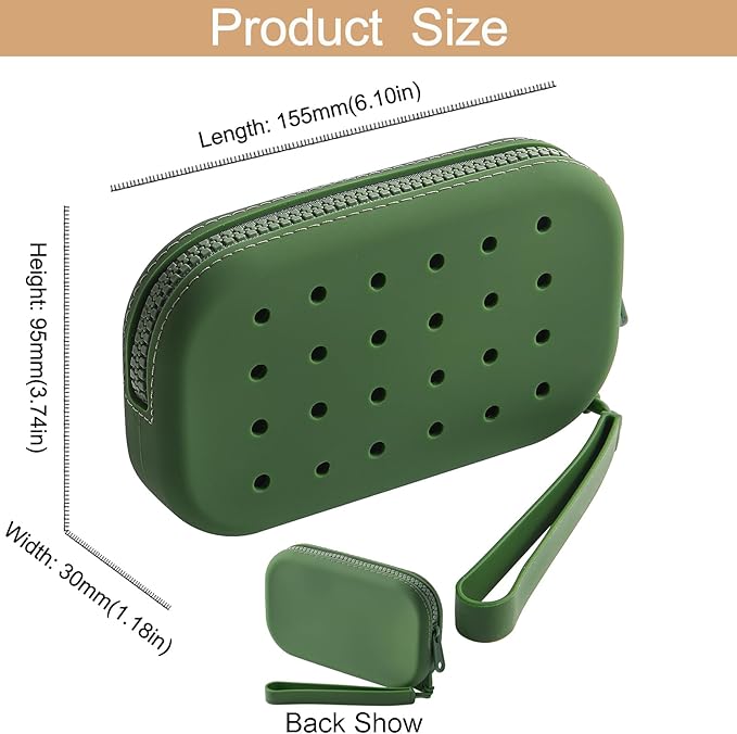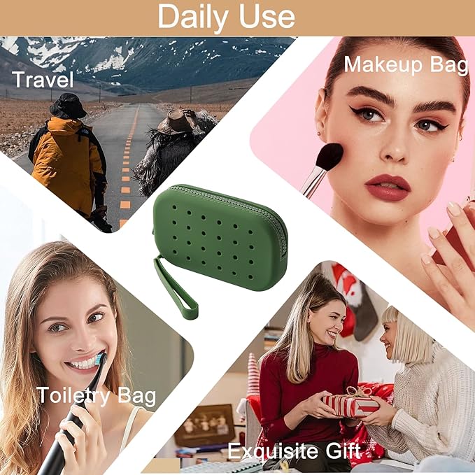 Portable Silicone Makeup Bag for Women, Small Travel Toiletry Cosmetic Bag with Decorative Holes, Zipper Closure Organizer Makeup Case with Handle (Green)