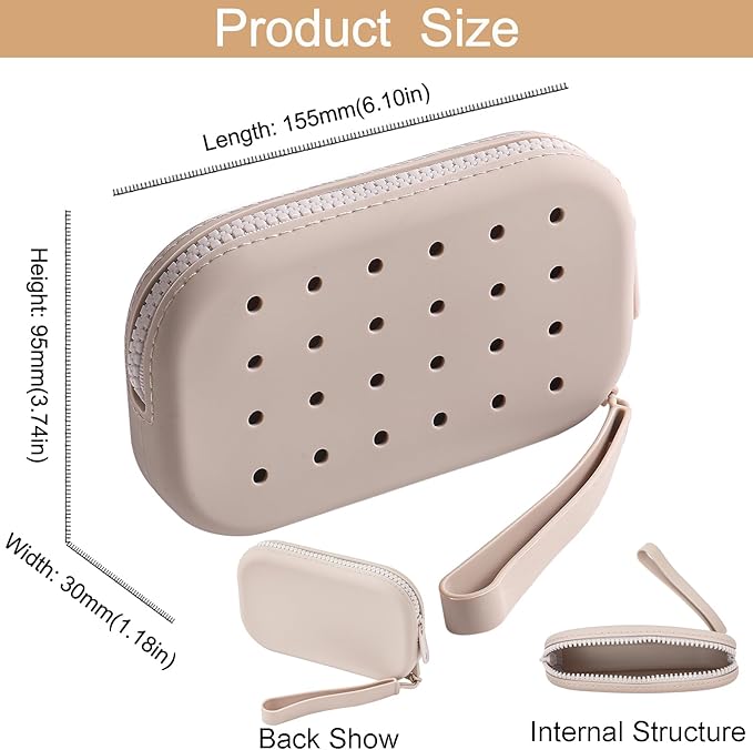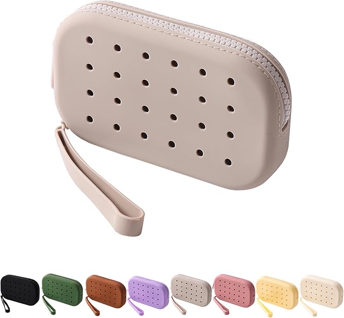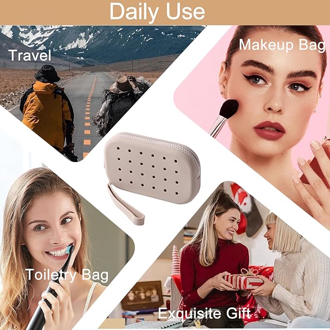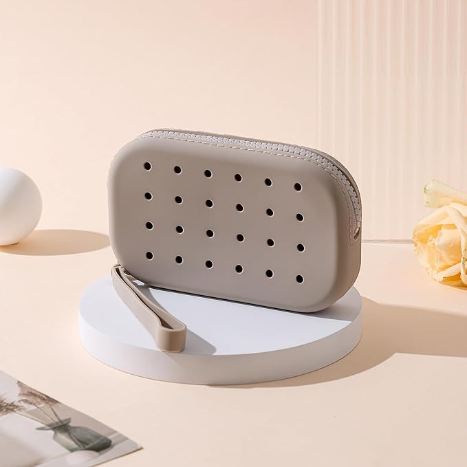 Portable Silicone Makeup Bag for Women, Small Travel Toiletry Cosmetic Bag with Decorative Holes, Zipper Closure Organizer Makeup Case with Handle (Grey)