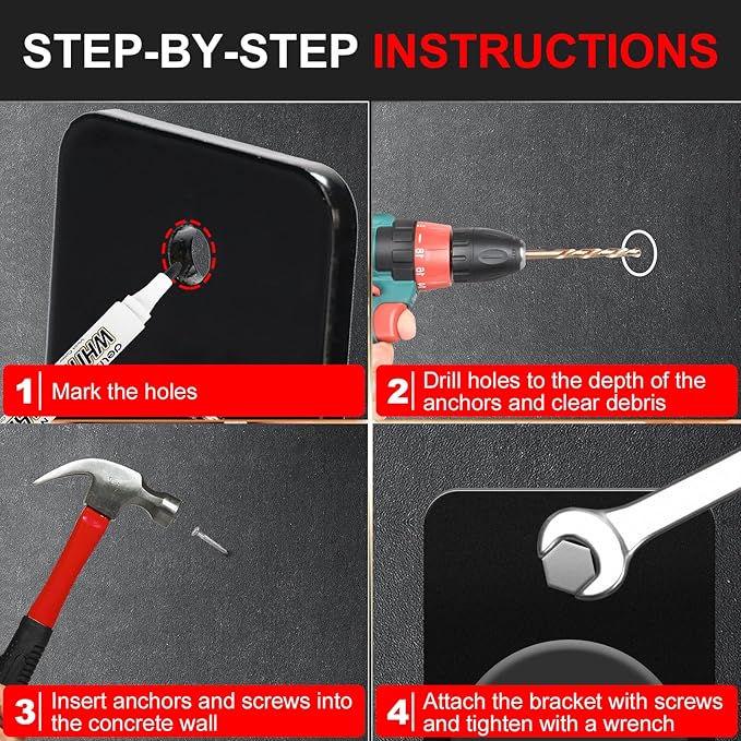 • Weight Plate Storage Rack for Home Gym - Wall-Mounted Bumper Plate Holder with Heavy Duty Steel · High Capacity Storage: Designed to hold multiple weight plates securely, perfect for organizing your home gym. · Tilted Plate Holder: Slight 2° tilt prevents plates from sliding off, keeping them safely stored. · Durable & Scratch-Resistant: High-quality steel with a protective hard-coat finish. · Universal Fit: Fits all 2" Olympic weight plates, with included installation hardware for both wood and concrete walls. · Impact Protection: Foam padding reduces wear and tear on plates and the rack.
