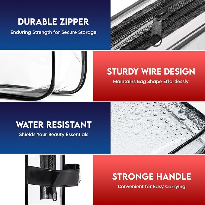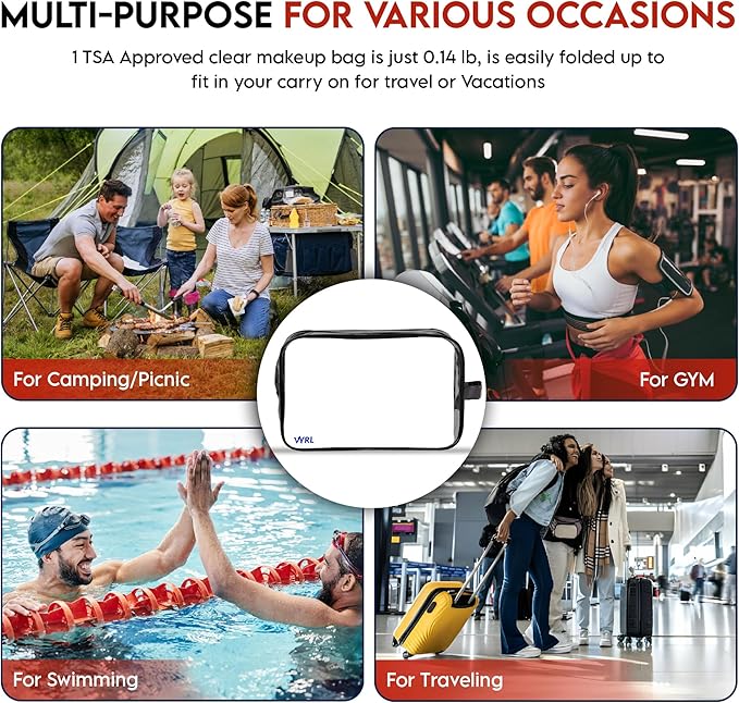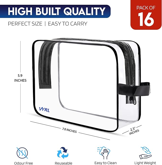 - π₯π§π¦π-ππ½π½πΏπΌππ²π±: VYRL 8.46 x 6.3 x 1.18 inches clear travel bags for toiletries strictly adhere to the TSA 3-1-1 liquids rule. The quart-size transparent clear cosmetic bag design ensures a swift pass through airport security & easily spot your essentials in a breeze.