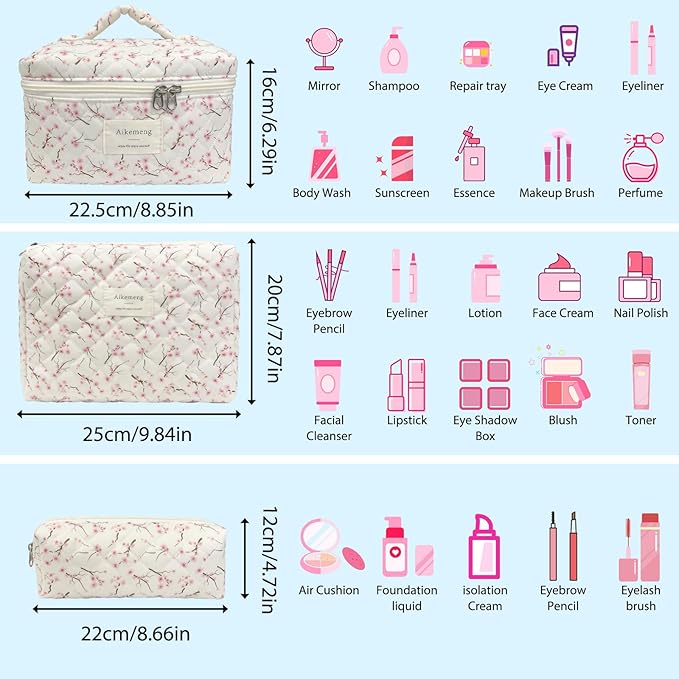 3 Piece Floral Quilted Makeup Bag, Large Capacity Travel Cosmetic Bag for Women and Girls, Aesthetic Storage for Daily and Travel Use (3pcs-peachblossom)