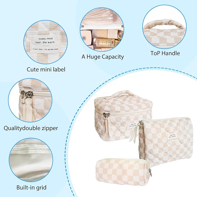 3 Piece Brown Checkered Corduroy Quilted Makeup Bag Set, Large Capacity Travel Makeup Bags for Women and Girls, Includes Small, Medium, and Large aesthetic makeup&Cosmetic Bags (3pcs-BrownCheckered)