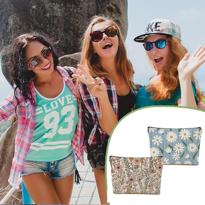 2pcs Vintage Floral Makeup Bag, Daisy Flower Cosmetic Bag Garden Gifts for Women Female Girls Sister BFF Nature Lover, Travel Zipper Pouch Christmas Thanksgiving Birthday Gifts