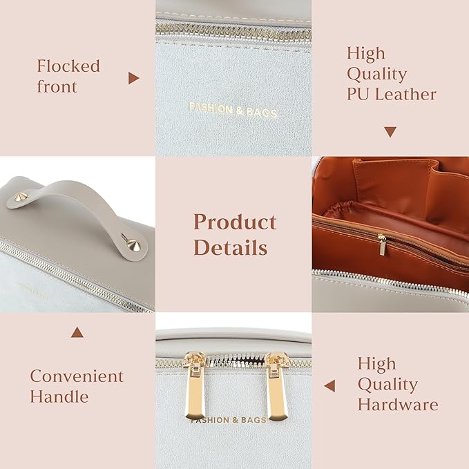 - Large opening design with zipper,easy access to your cosmetics.Inside the bag,there are two large compartments and a zippered compartment,help you to sort and store your makeup tools neat and tidy.