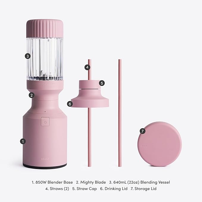 - WHAT'S INCLUDED: 850W Blender Base, Beast Mighty Blade, Blade Cleaning Brush, 22oz Blending Vessel, Storage Lid, Drinking Lid, Carry Cap, Straw Cap, 2 Straws, Straw Cleaning Brush