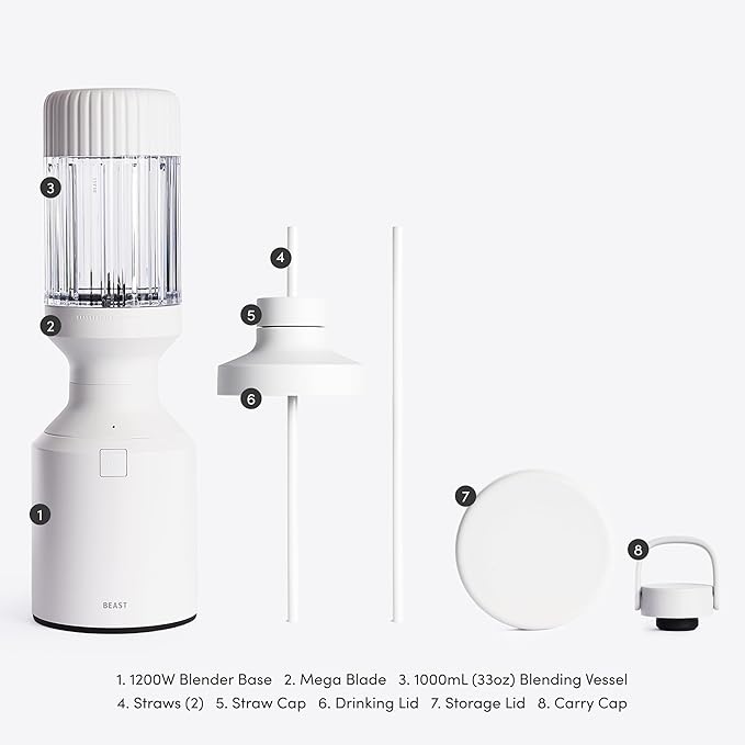 - WHAT'S INCLUDED: 1200W Motor Blender Base, Beast Mega Blade, 1000mL Blending Vessels, Storage Lid, Drinking Lid, Carry Cap, Straw Cap, 2x Straws. Designed for 120V use only.