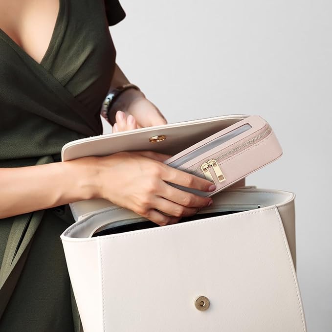 - [Versatile and Organized]- This travel makeup brush holder is perfect for storing makeup brushes and daily mini essentials like jewelry,lip balms, hair ties, Air Pods, charging cords,even pencils. Easily put into your purse, backpack, tote, or travel bag for convenient access to your essentials.