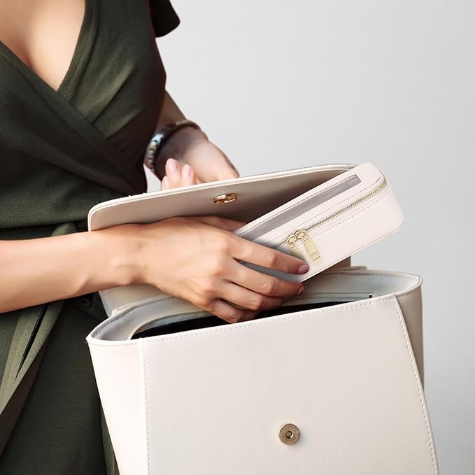 - [Versatile and Organized]- This travel makeup brush holder is perfect for storing makeup brushes and daily mini essentials like jewelry,lip balms, hair ties, Air Pods, charging cords,even pencils. Easily put into your purse, backpack, tote, or travel bag for convenient access to your essentials.