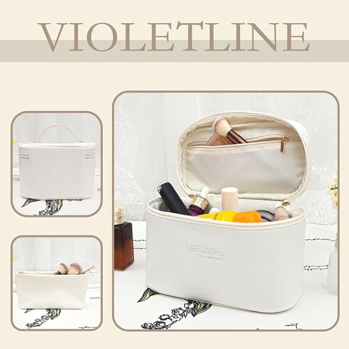 Travel Cosmetic Bag for Women, PU Leather Cosmetic Bag Set of 2, Waterproof, Large Makeup Bag with Handle (White makeup bag)