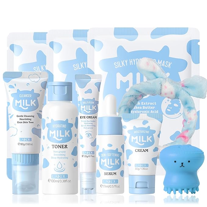 - 【10 IN 1Milk Facial Care Set】 This skincare for girls 10-12 set includes everything for a complete routine: cleanser, toner, eye cream, serum, moisturizing cream, 3 hydrating masks, a soft headband, and an octopus cleansing brush. Perfect for daily use or as a travel-ready kit.