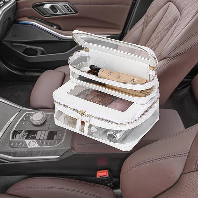 Travel Clear Makeup Bag with Brush Case TSA Approved Toiletry Bag Waterproof Cosmetic Organizer Car Essential for Women (White, M+SLIM)