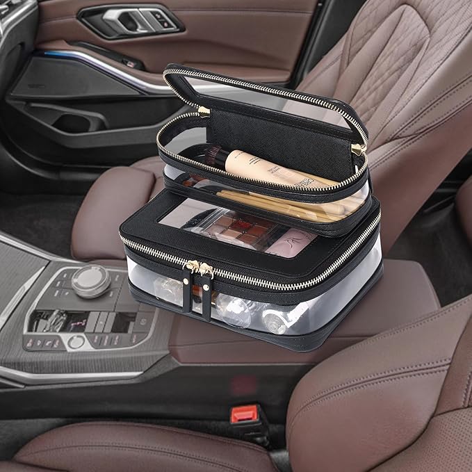 Travel Clear Makeup Bag with Brush Case TSA Approved Toiletry Bag Waterproof Cosmetic Organizer Car Essential for Women (Black, M+SLIM)