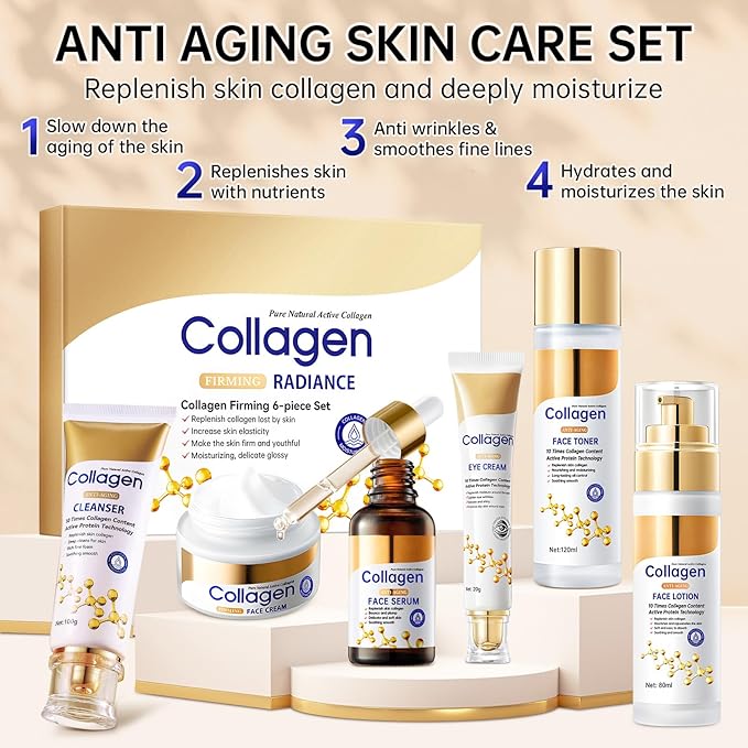 Collagen Skin Care Set, Anti Aging Skincare Gift Set for Wrinkles & Fine Lines, Shrink Pores, Hydrate & Firm Skin, 6 Pcs Skincare Kits for Women with Cleanser, Toner, Lotion, Serum, Cream, Eye Cream.