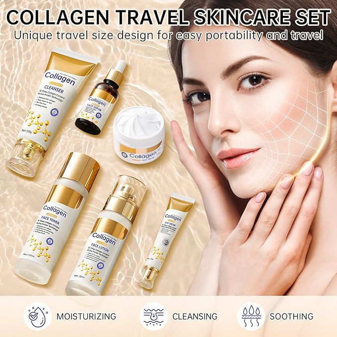 Collagen Skin Care Set, Anti Aging Skincare Set for Face, Shrink Pores, Hydrate & Firm Skin, 6 Pcs Individually Packaged Skincare Kits for Women with Cleanser, Toner, Lotion, Serum, Cream, Eye Cream.