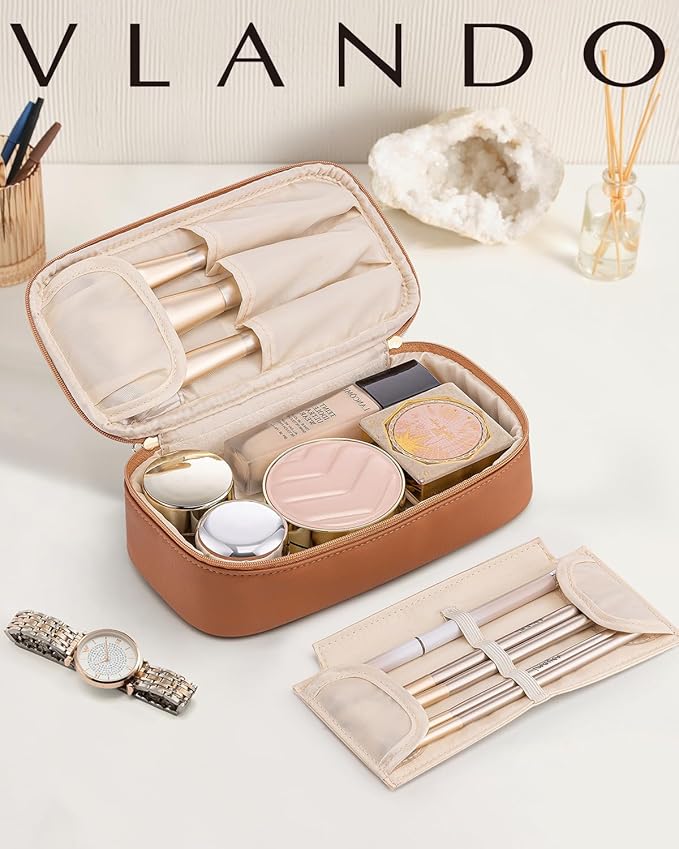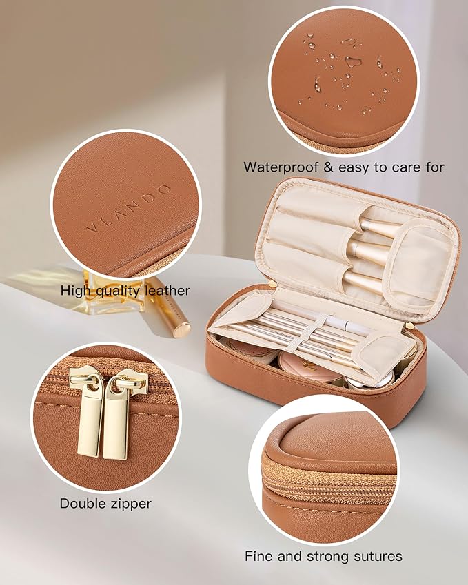 Vlando Travel Makeup Bag,Small Makeup Bag for Women,Gifts for Women Girls, Makeup Pouch Purse Travel Essentials Toiletries-Brown