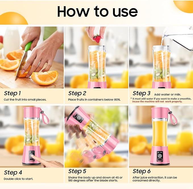 - 【Use The Steps Correctly】Step 1: Cut the fruit into small pieces and add to about 80% of the cup. Step 2: Add water or milk, otherwise it won't work properly. Step 3: Turn the machine upside down so that the blades are fully exposed. Step 4: Double-click the start switch. Step 5: Turn the blade for 1-2 seconds, then place the machine upright and shake the machine while juicing.