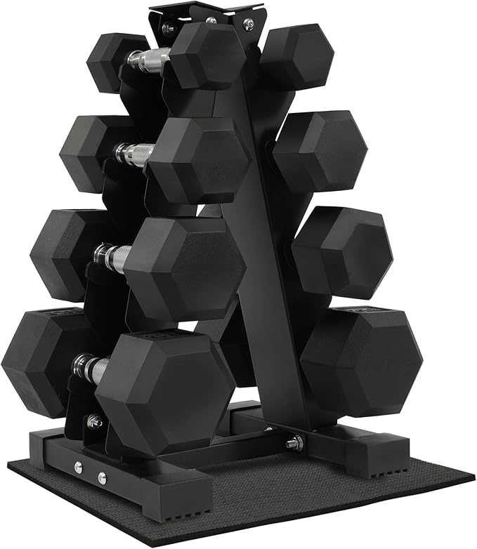 Rubber Coated Hex Dumbbell Weight Set and Storage Rack, 100LB Set or 150LB Set, 5-20 lbs Pairs or 5-25 lbs Pairs