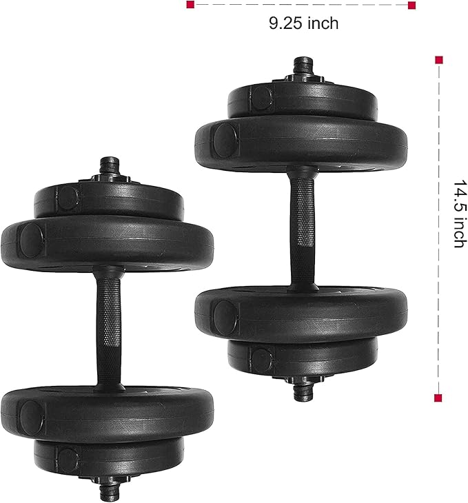 - Adjustable Weight: Weights come in 4 2.5-pound cement plates and 4 7.5 pound cement plates with 2 14-inch dumbbell handles and 4 collar locks