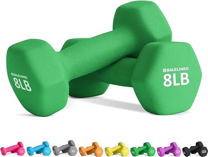 - STYLISH AND MODERN: Balelinko neoprene coated dumbbell weights are sold in pairs and available in 1, 2, 3, 4, 5, 6, 8, 10, 12, 15pounds, which allow you vary the intensity of your workouts. Bright colors and large, clear numbers make these quick and easy to grab while in the zone.