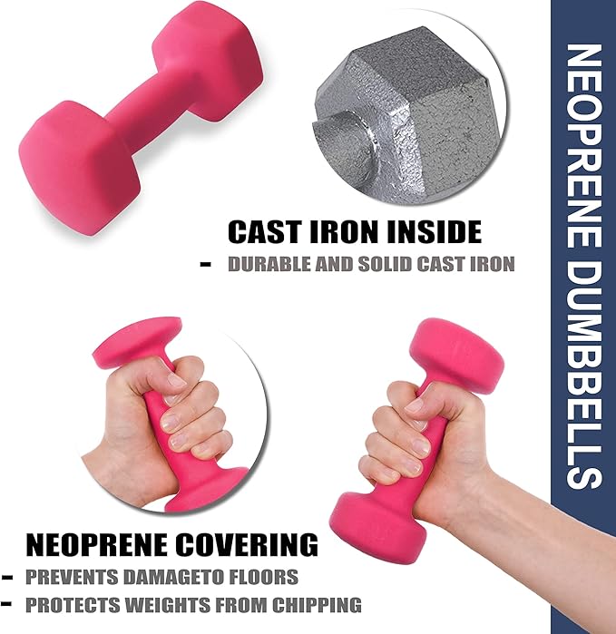 - HEXAGONAL SHAPE NEOPRENE DUMBBELLS: These hexagonal-shaped neoprene dumbbells are designed to stay in place, preventing rolling and protecting your floors from damage and cracking,chipping. Crafted from durable cast iron, they are perfect for light weightlifting and muscle toning.