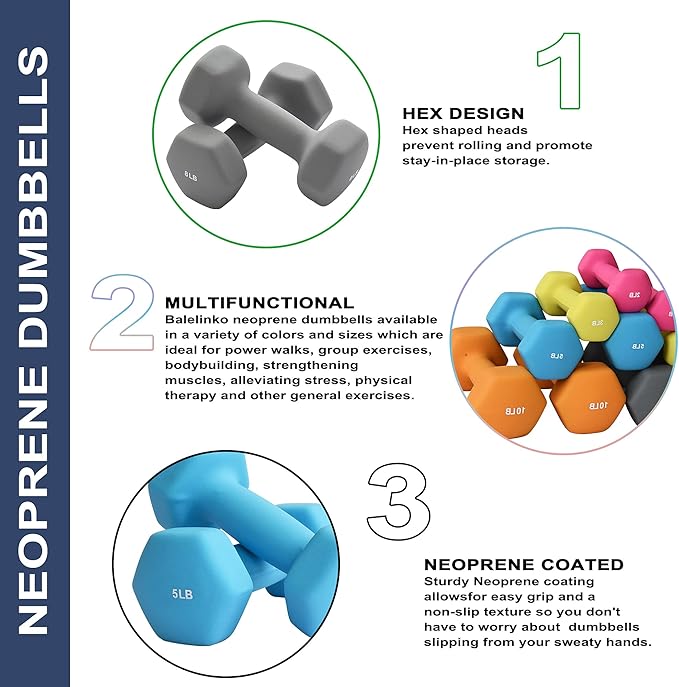 - NON-SLIP COMFORT GRIP: Featuring a soft neoprene coating, these dumbbells offer a comfortable and ergonomic grip that absorbs moisture, making them ideal for a wide range of indoor and outdoor exercises.