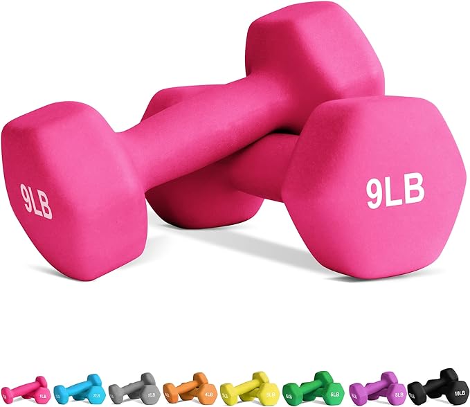 - PACKAGE INCLUDES: This weight set includes two 9 lb neoprene dumbbells (18 pounds total), making them perfect for yoga exercises and other on-the-go workouts.