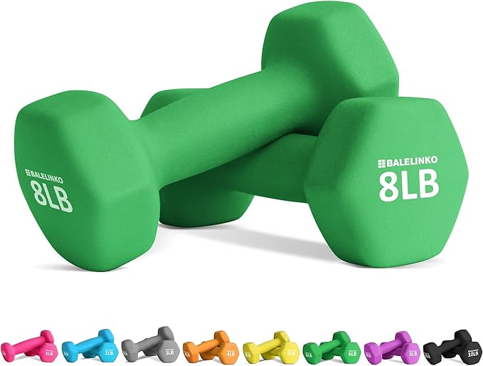 - STYLISH AND MODERN: Balelinko neoprene coated dumbbell weights are sold in pairs and available in 1, 2, 3, 4, 5, 6, 8, 10, 12, 15pounds, which allow you vary the intensity of your workouts. Bright colors and large, clear numbers make these quick and easy to grab while in the zone.