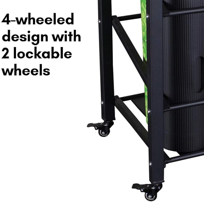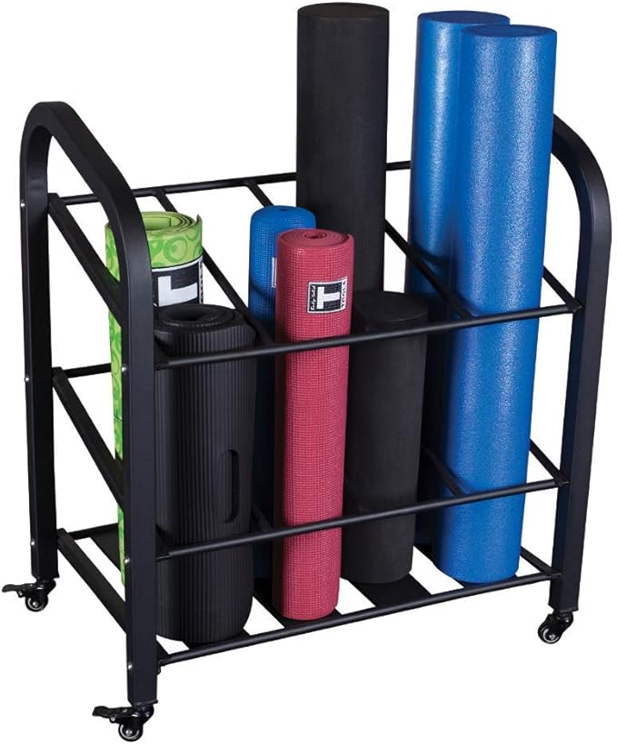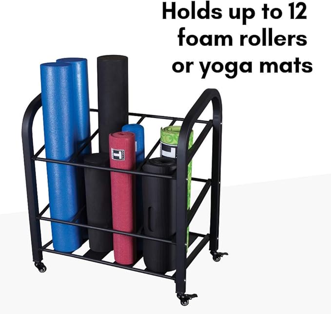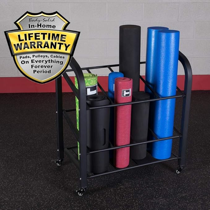 - MOBILE & SECURE: Equipped with four wheels for effortless mobility, the Body-Solid Foam Roller Yoga Mat Rack can be easily moved to any area of your fitness space. With two lockable wheels, it remains stable and secure once you've found the perfect spot, ensuring your equipment stays organized and in place.