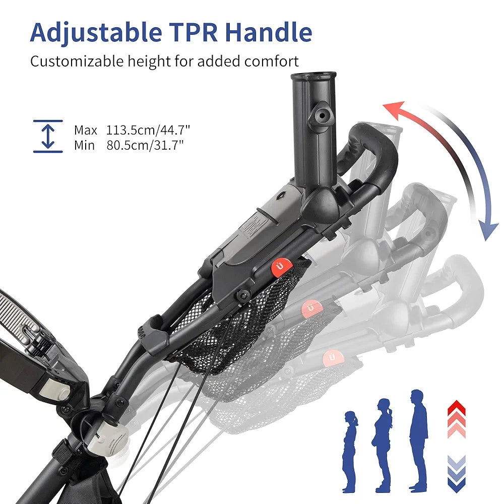 - Effortless Maneuverability: Adjustable handle height and a 25.5-inch wide body provide smooth control across uneven terrain. Built for walking golfers who want ergonomic comfort, steering control, and course versatility.
