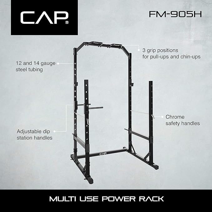 • Features – Gusseted uprights provide exceptional stability and security. Three grip positions for pull ups and chin ups. Adjustable dip station handles and chromed safety handle. J-cup bar catches for safe weight storage.