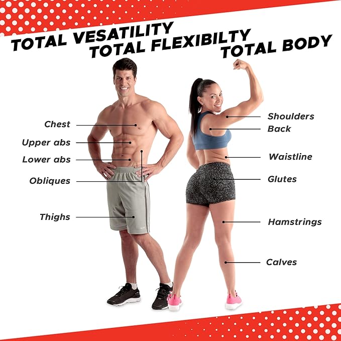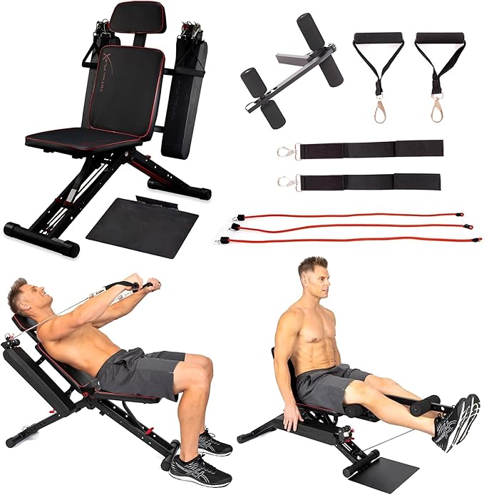 - Includes: TOTAL FLEX L, Foot Plate, Ankle Straps, Handle Grips with Clips to allow for interchangeable resistance weight sets, Receptor Bracket, Head Rest, Leg Extension with 3 bungee cords, Manual and live streaming access