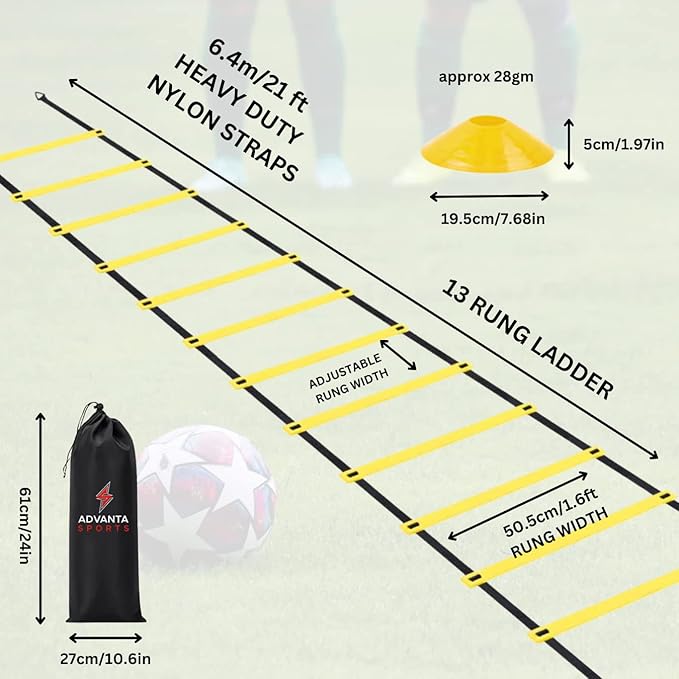 - ✅ PREMIUM AGILITY LADDER SET – The 21-foot agility ladder, 13 cones, 1 carry bag, & 4 stakes are all part of the ADVANTA SPORTS Agility Ladder Training Set. Everything is included to increase your explosiveness, agility, speed, &fitness. Designed for: football equipment, boxing training equipment, agility ladder and hurdles, football ladder, speed and agility training equipment, soccer practice equipment, basketball equipment training, speed ladder agility ladder, soccer coach, soccer trainer.